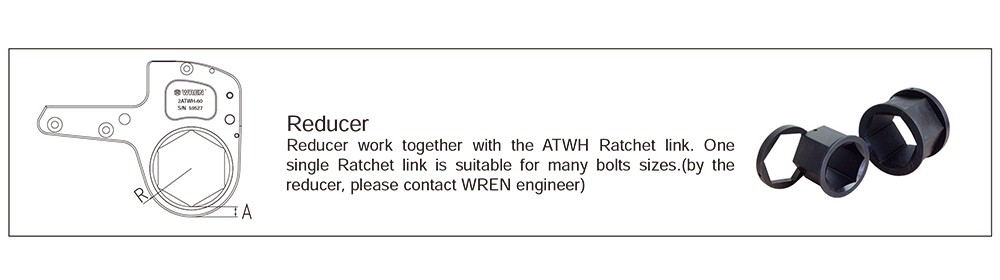 ATWH series is the professional Low profile hydraulic torque wrench which WREN extends in international market.compared with the square drive hydraulic torque wrench , this series work directly on the nuts , and its body suits well in the narrow space . ATWH covers the nuts from S19 to S175 . to fulfill all different working situation , the user can just replace the hexagon cassette because the hexagon cassette is changeable , or add the reducer. WREN provide after-sales service all over the world , and already got the approved by TUV certificate.
