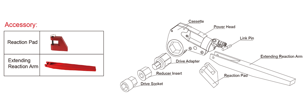 H low profile torque wrenches designed for accessing limited areas and serves goog solutions with numbers of replaceable cassettes and adaptors. Drivers can be replaced easil and fast without using any tolls. Saves time by means of easy replacement of attachments. Light weight aluminum design allows easy operations even in robust conditions.