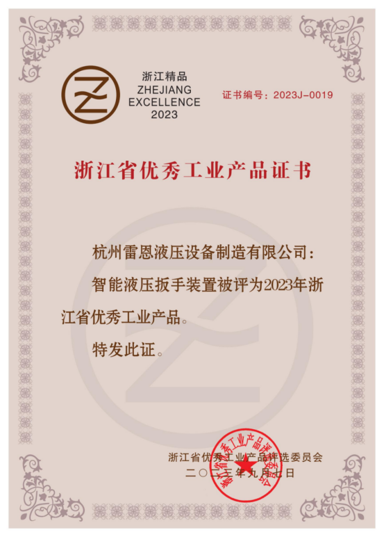 雷恩液壓 | 榮獲2023年浙江省優(yōu)秀工業(yè)產(chǎn)品證書