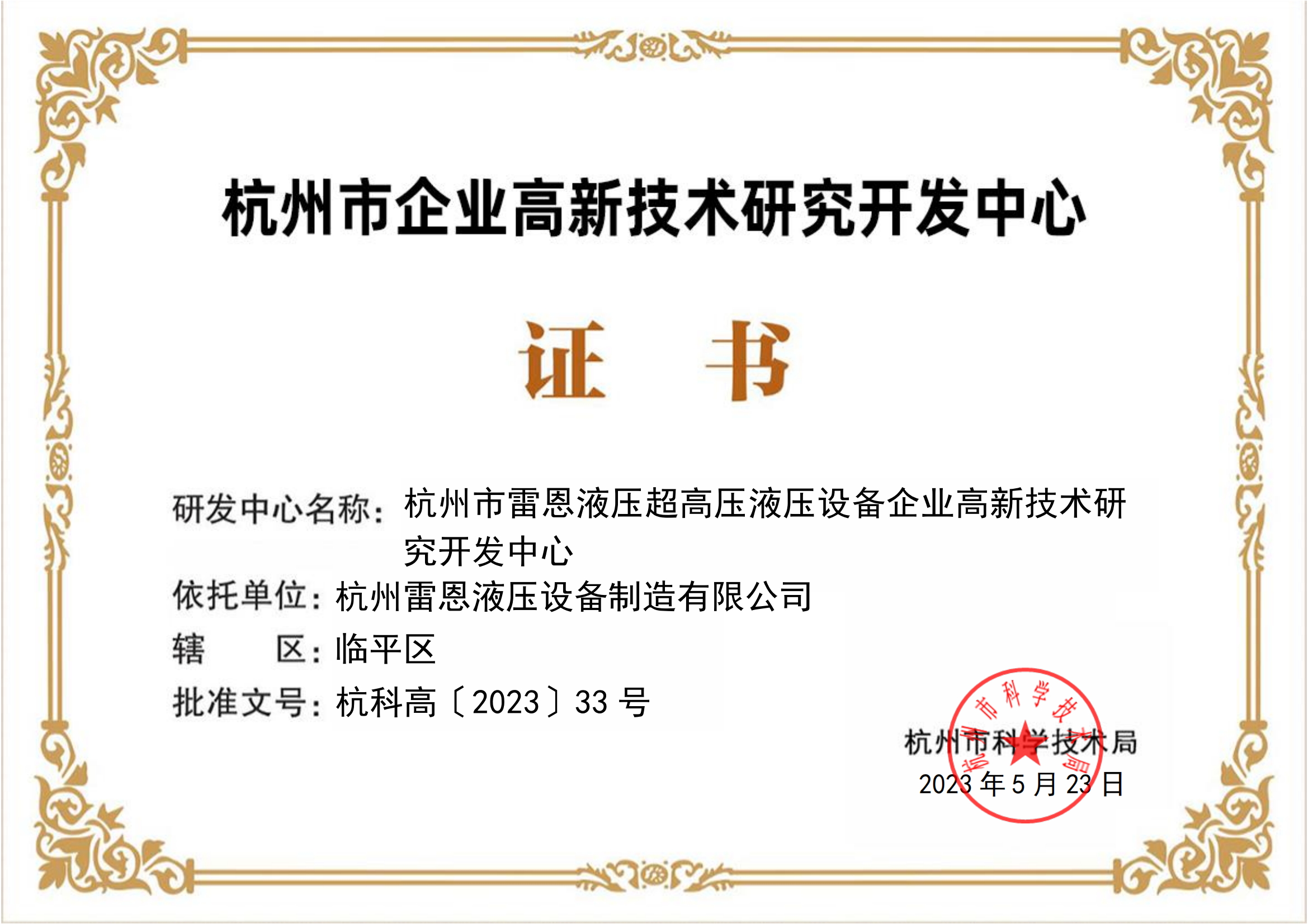 【喜訊】雷恩液壓通過“杭州市企業(yè)高新技術研究開發(fā)中心”認定