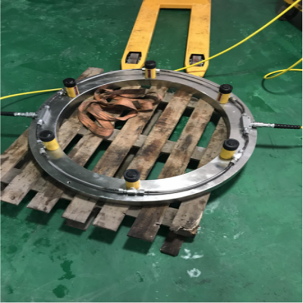 這次設(shè)計(jì)的主要原因是,浙江運(yùn)達(dá)風(fēng)電股份有限公司有一批主軸承,熱套后,軸承冷卻后容易回退,導(dǎo)致軸承安裝尺寸有偏差。為了防止該情況的產(chǎn)生,浙江運(yùn)達(dá)與我方聯(lián)合設(shè)計(jì)生產(chǎn)該產(chǎn)品——主軸承壓盤。主要作用是在主軸軸承熱套以后將主軸承壓盤至于其上,然后給承壓盤上的千斤頂打壓,千斤頂頂升以后將軸承固定在安裝位置,防止軸承冷卻后產(chǎn)生位移,從而導(dǎo)致安裝位置偏差。