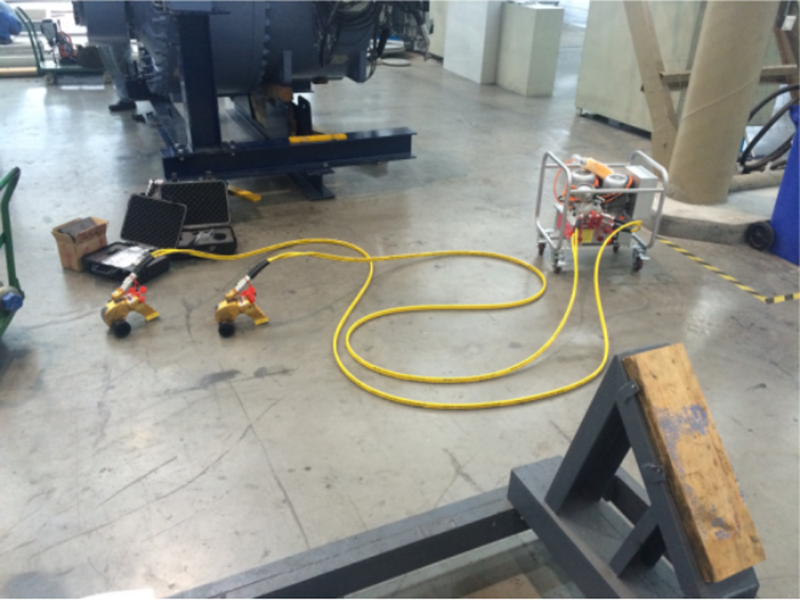 上海華儀風(fēng)能有限公司使用工況為1.5MW重齒齒輪箱主軸脹緊套安裝,螺栓為M33螺栓。由于該工況的安裝非常耗時(shí)耗力,所以我方研發(fā)出DHP220高速大流量雙電機(jī)泵及配套3ATW加強(qiáng)型液壓扭矩扳手專(zhuān)門(mén)針對(duì)主軸脹緊套工況的安裝,有效縮減了安裝時(shí)間,提升了安裝效率。
