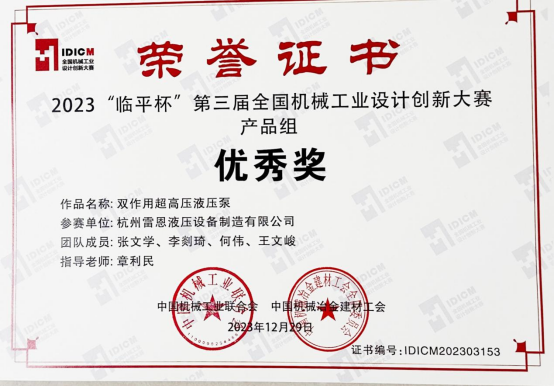 中國(guó)機(jī)械工業(yè)聯(lián)合會(huì)、中國(guó)機(jī)械冶金建材工會(huì)聯(lián)合行業(yè)和社會(huì)相關(guān)力量,共同組織完成了2023第三屆全國(guó)機(jī)械工業(yè)設(shè)計(jì)創(chuàng)新大賽。此次大賽,恭喜杭州雷恩液壓設(shè)備制造有限公司在指導(dǎo)老師章利民的指導(dǎo)下,團(tuán)隊(duì)成員張文學(xué)、李剡琦、何偉、王文峻共同設(shè)計(jì)的“雙作用超高壓液壓泵”在2023“臨平杯”第三屆全國(guó)機(jī)械工業(yè)設(shè)計(jì)創(chuàng)新大賽產(chǎn)品組中獲得了優(yōu)秀獎(jiǎng)。