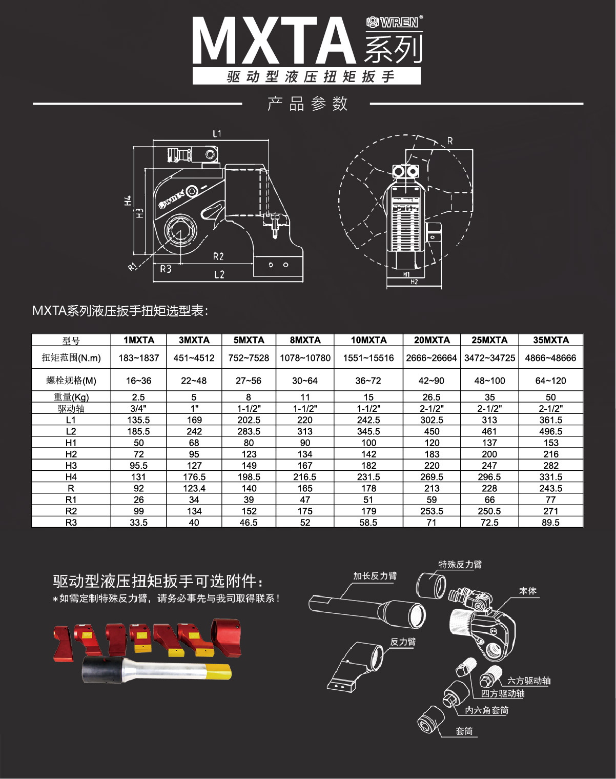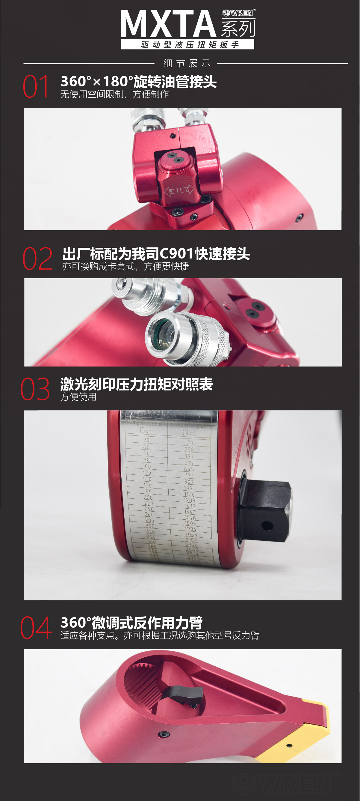 MXTA系列是WREN公司主力投放國(guó)內(nèi)市場(chǎng)的一款專業(yè)級(jí)別的液壓扭矩扳手。其鋁鈦合金的航空材料的液壓扭矩扳手重量輕,強(qiáng)度高,值得注意的是MXTA系列液壓扭矩扳手擁有從112N.m-48666N.m共8個(gè)標(biāo)準(zhǔn)型號(hào),可以出色完成螺栓的鎖緊以及拆卸工作。WREN品牌提供全球售后服務(wù),擁有完整的配套供應(yīng)能力,通過德國(guó)萊茵TUV認(rèn)證及歐盟CE認(rèn)證。