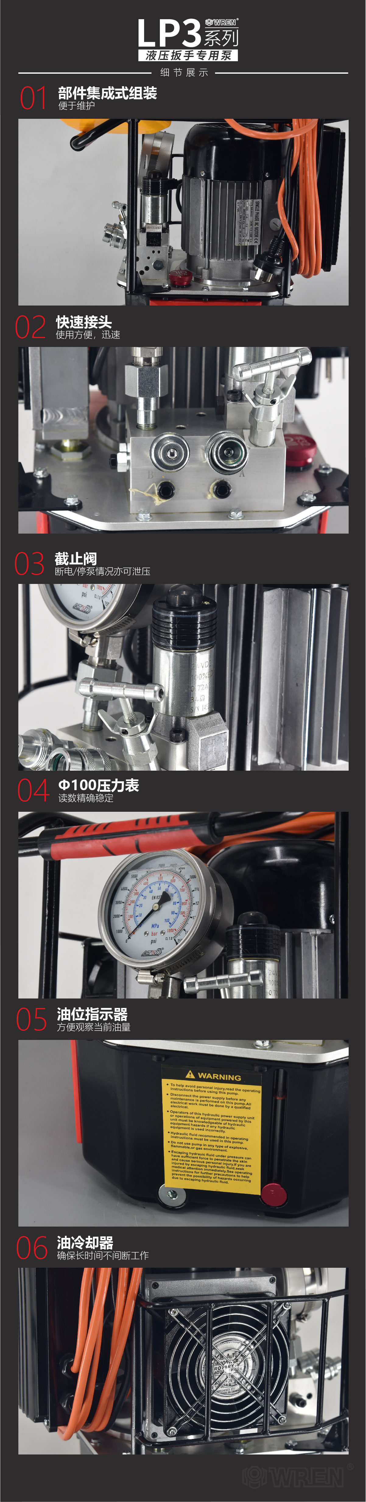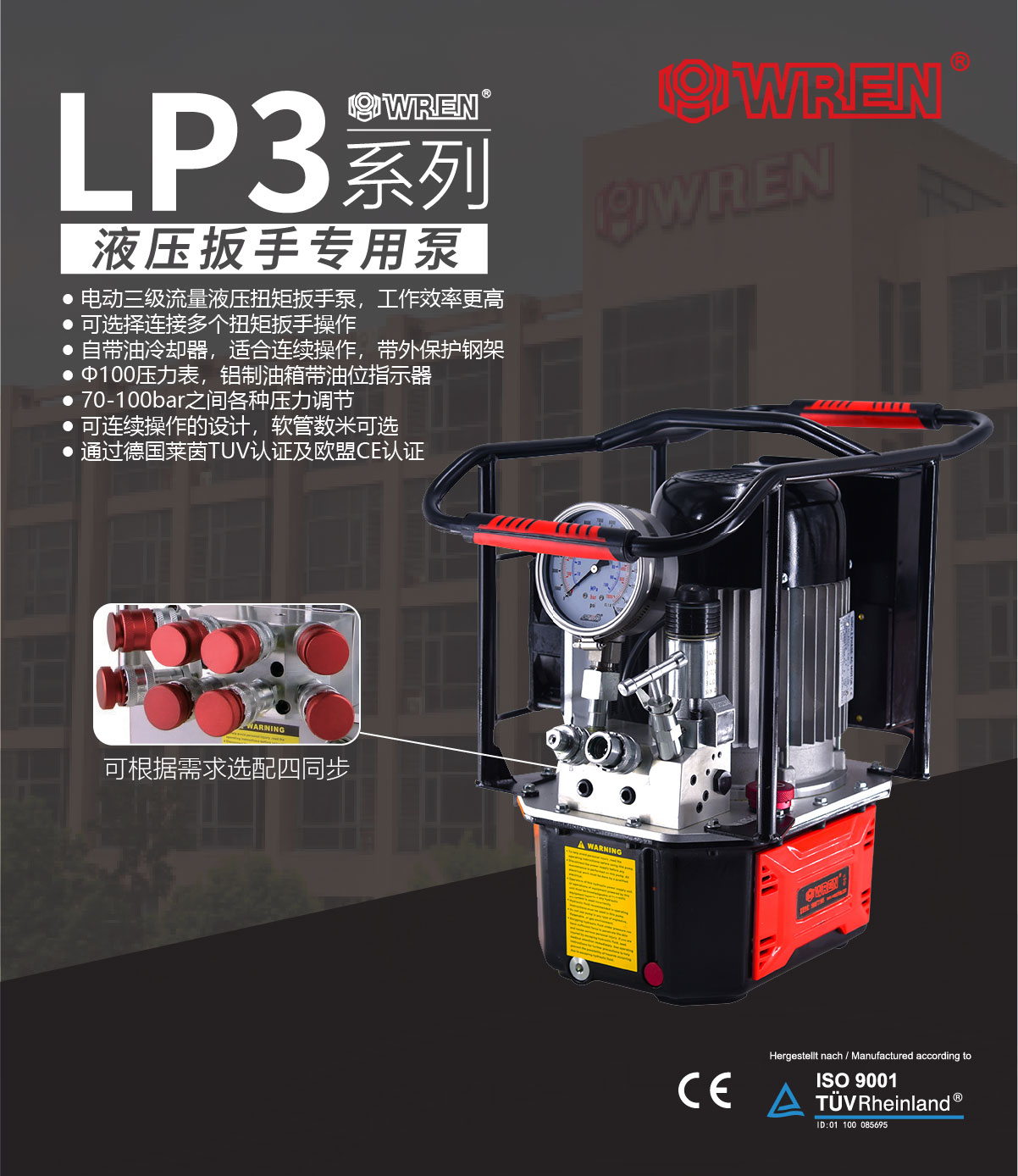 ? ? ? LP3系列為液壓扳手專用泵,采用集成方式組裝,由動力單元、電氣電元、控制裝置等組成第一種獨立完整的液壓裝置,具有流量大、體積小、重量輕、結(jié)構(gòu)簡單、操作方便、工作壓力高等特點,并且高壓出口(A口)出油壓力可在70~700bar間任意調(diào)節(jié)。
