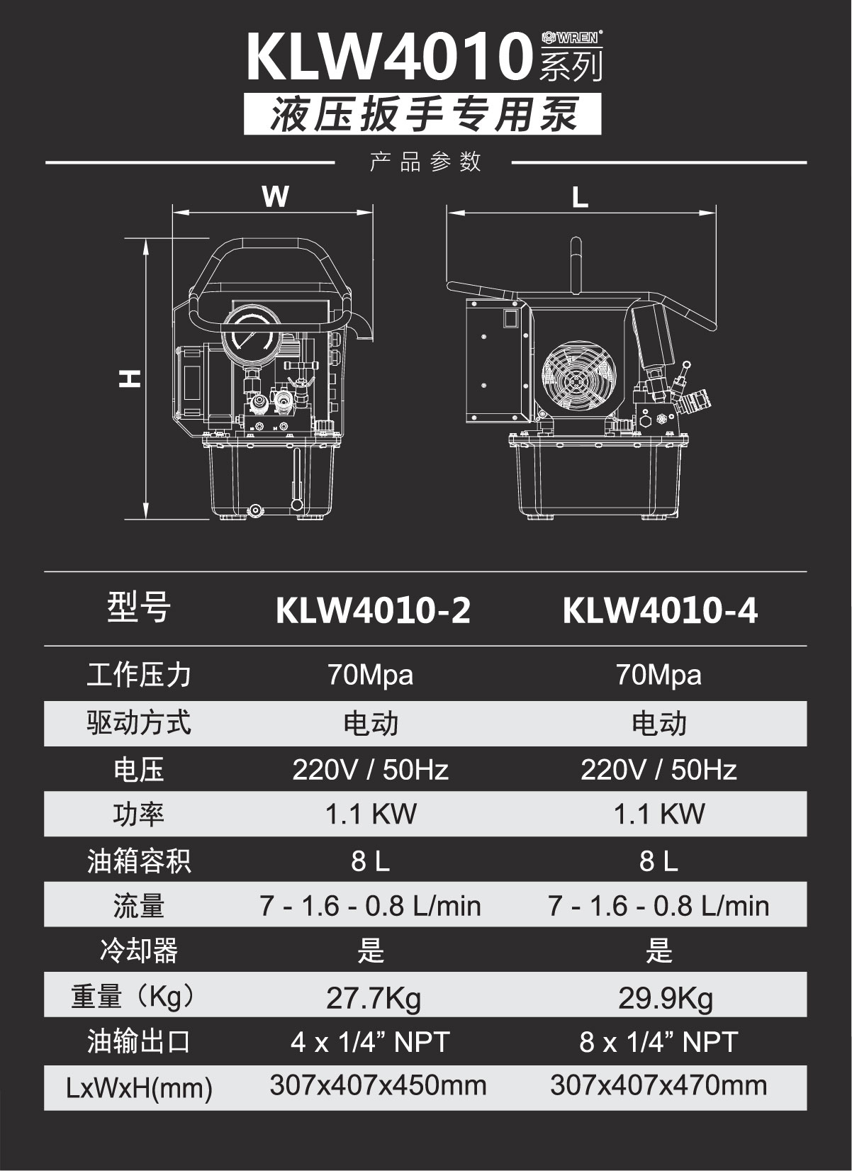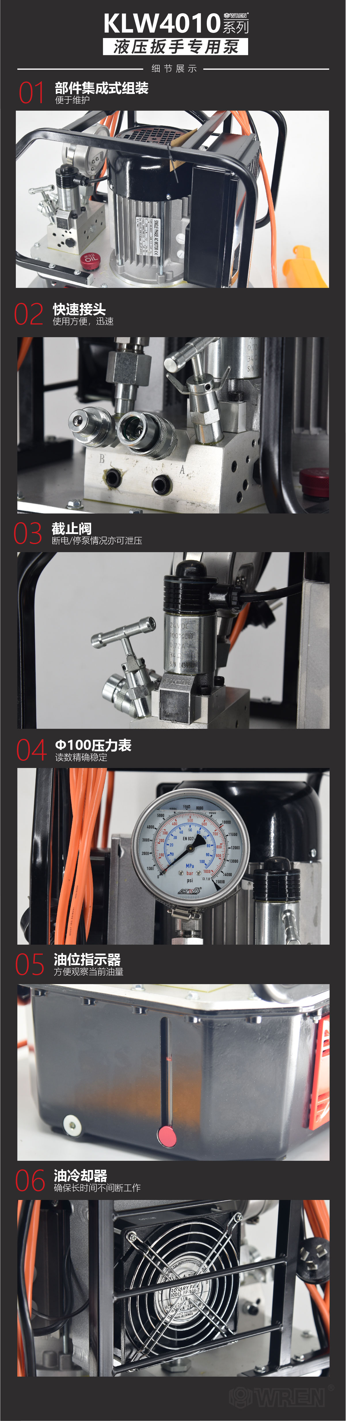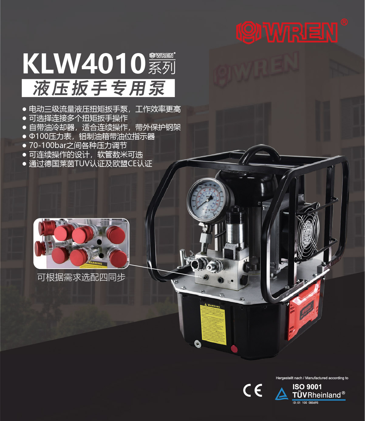 KLW4010為液壓扳手專用泵,采用集成方式組裝,由動(dòng)力單元、電氣單元、控制裝置等組成的一種獨(dú)立完整的液壓裝置,具有流量大、體積大、重量輕、結(jié)構(gòu)簡(jiǎn)單、操作方便、工作壓力高等特點(diǎn),并且高壓出口(A口)出油壓力可在70~700bar之間任意調(diào)節(jié)。