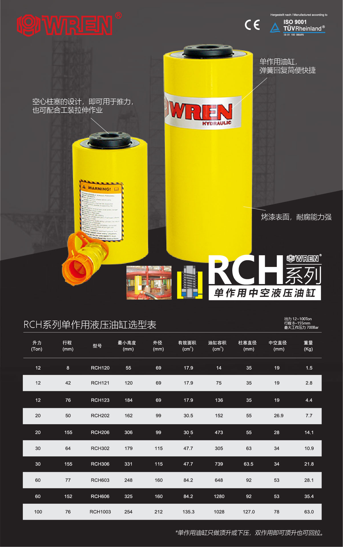 RCH系列單作用中空型液壓油缸選型表