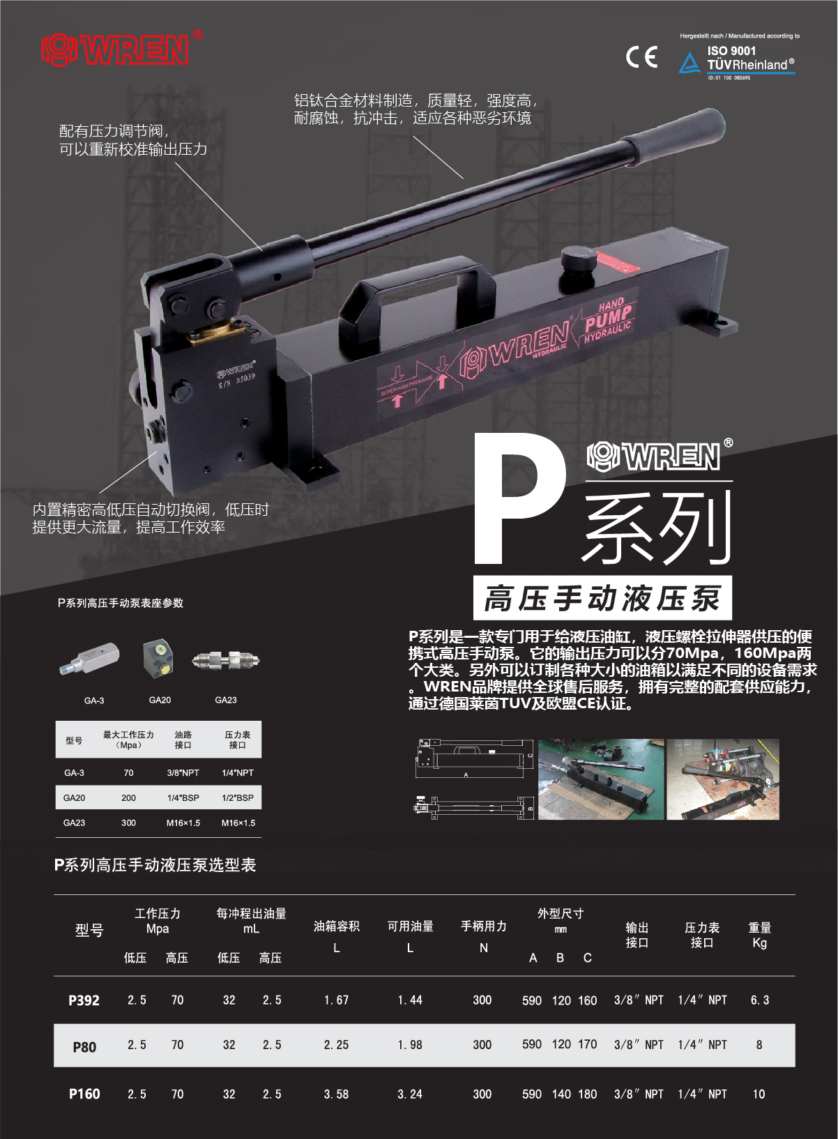 P系列是一款專門用于給液壓油缸供壓的便攜式高壓手動泵它的輸出壓力是70MPa。另外可以定制各種大小的油箱以滿足不同的設備需求。WREN品牌提供全球售后服務,擁有完整的配套供應能力,通過德國萊茵TUV及歐盟CE認證。